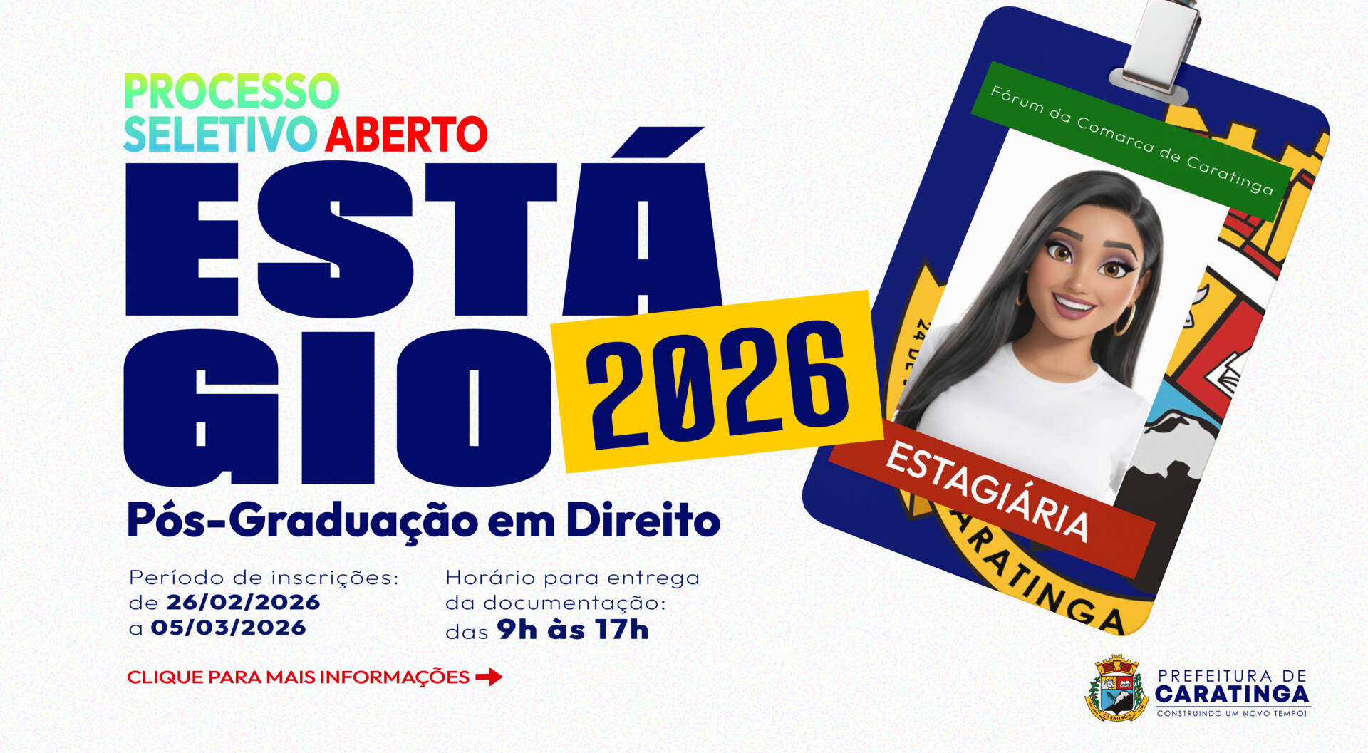 A Prefeitura Municipal de Caratinga torna público o Edital de Seleção nº 001/2026, referente ao Processo Seletivo Simplificado destinado ao preenchimento de 07 (sete) vagas de estágio de pós-graduação em Direito, para atuação no Fórum da Comarca de Caratinga/MG. A seleção ocorre nos termos do Acordo de Cooperação nº 473/2025, celebrado entre o Município de […]