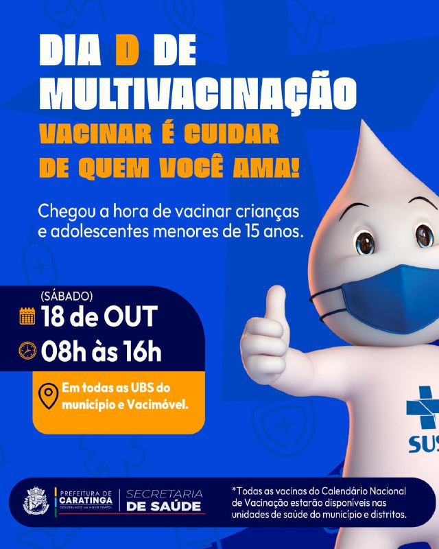 A Prefeitura de Caratinga, por meio da Secretaria Municipal de Saúde, realiza neste sábado, 18 de outubro, o Dia D de Multivacinação, com o objetivo de atualizar a caderneta vacinal de crianças e adolescentes menores de 15 anos. Durante todo o dia, das 8h às 16h, todas as Unidades Básicas de Saúde (UBS) do município […]